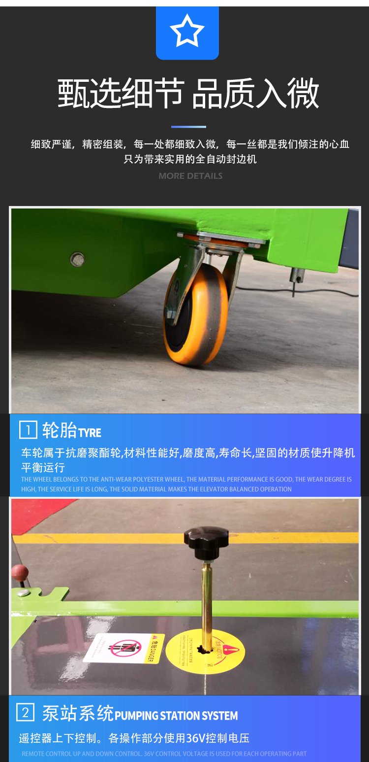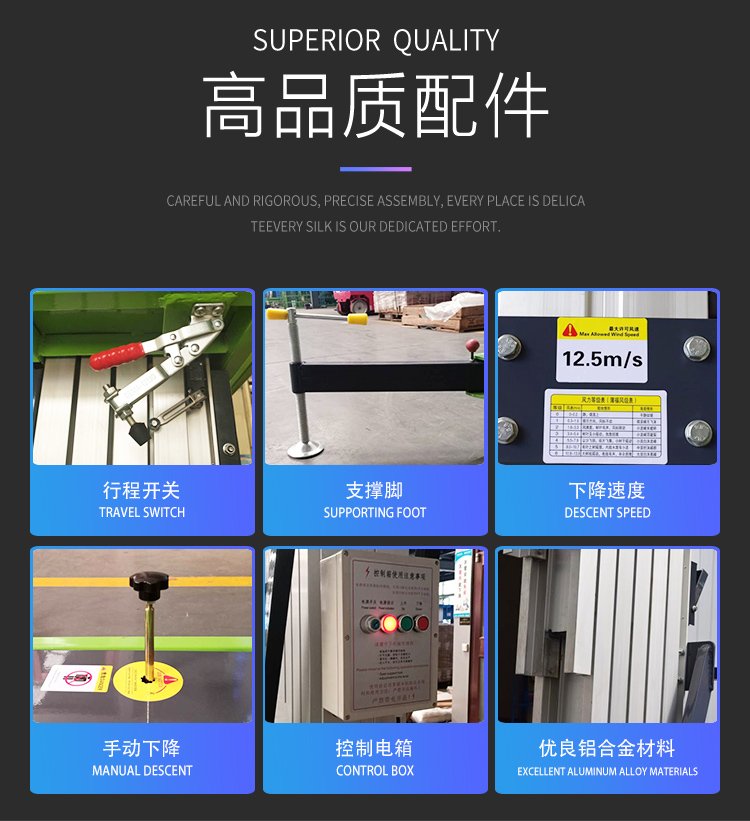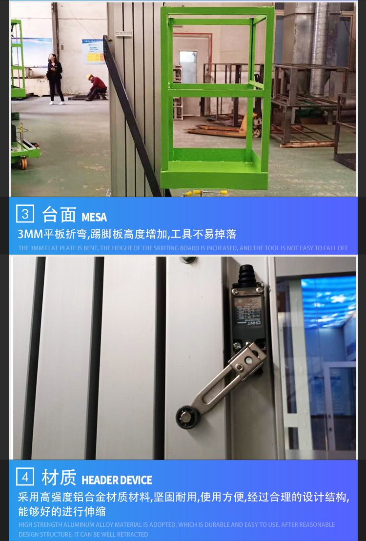 鋁合金液壓升降機主體采用高強度鋁合金材質構成,具有造型美觀、體積小、重量輕、升降平衡、安全可靠等優點,廣泛用于工廠、賓館、餐廳、車站、機場影劇院、展覽館等場所。該升降機承載能力強,適合于兩人(可攜帶一定的重量工具和材料)同時登高作業;還可根據不同環境訂制成各種非標產品,以滿足不同需要;是保養機具、油漆裝修、調換燈具、電器、清潔保養等用途的安全伴侶。