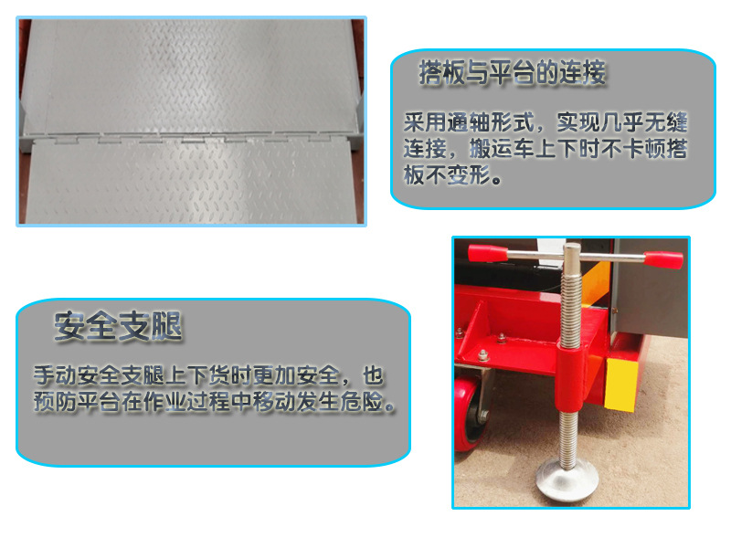 5. 本登車橋嚴(yán)禁人貨載,貨物裝上平臺(tái)后掛上防護(hù)鏈條,工作人員應(yīng)站立于地面控制平臺(tái)升降作業(yè)。