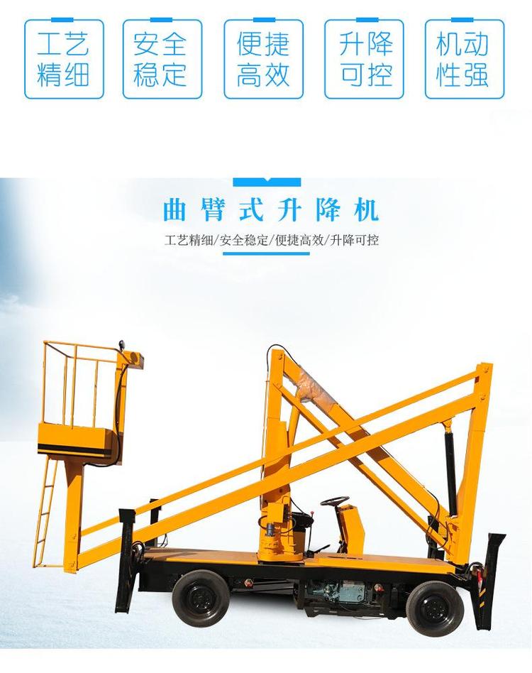 曲臂式液壓升降平臺具有操作簡單、使用方便、作業半徑大、能360度自由※旋轉等特點,特別能夠懸伸作業,跨越一定的障礙物或在一處升降,并可進行大范圍多點作業,極大地提高了工作效率。曲臂式液壓升降平臺廣泛應用于市政、小區、工礦企業,用于路燈修理、修剪園林、更換車間頂部照明燈、高空清潔等單人高空作業的。