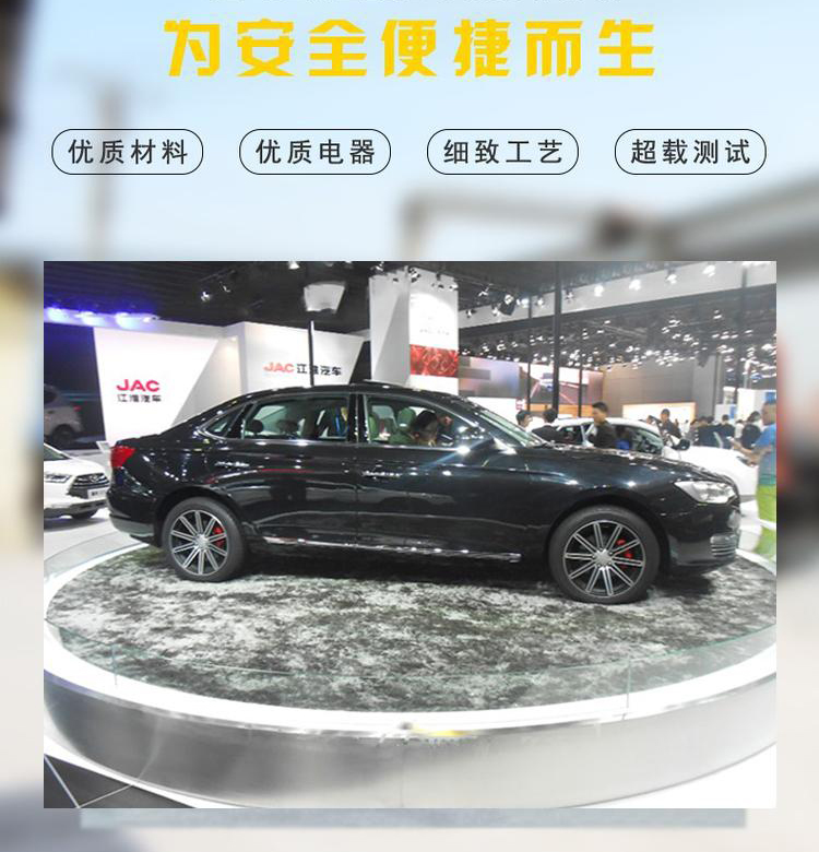 汽車旋轉展臺使用壽命長、精度高準。而高度偏低的薄款汽車旋轉展臺則是為汽車展會及汽車4s店量身打造的,其特點是組裝拆卸快速、周轉物流便利,而且該款旋轉展臺使用壽命長,精度高準,方便于調頭變向,室內及戶外均可使用。