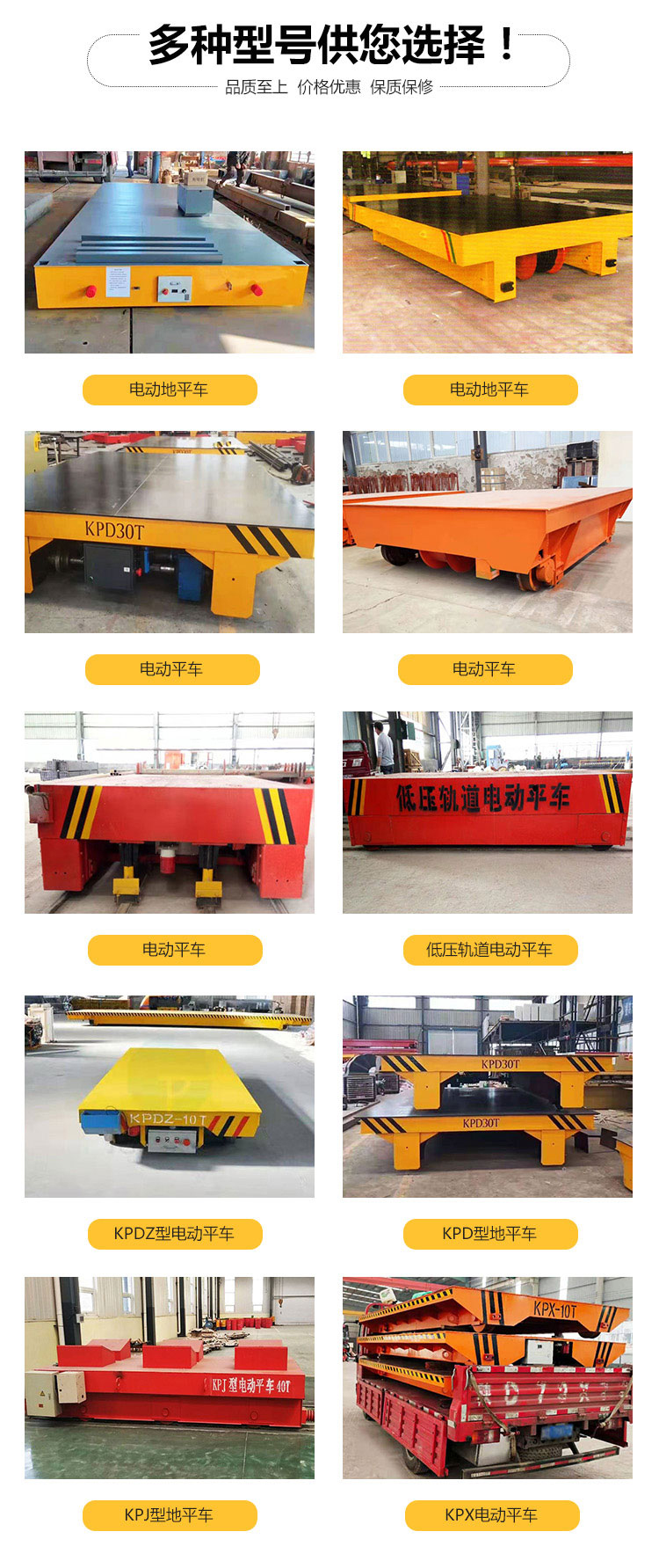 電動(dòng)平車,又稱電動(dòng)平板車、電平車、臺(tái)車、過跨車、電動(dòng)軌道車、地爬車等,是一種廠內(nèi)有軌電動(dòng)運(yùn)輸車輛,首先它是一種軌道型運(yùn)輸車輛,需要在地面上鋪設(shè)軌道,軌道一般為工字型面接觸道軌;其次它是電驅(qū)動(dòng)車輛,在電機(jī)減速機(jī)驅(qū)動(dòng)下自動(dòng)運(yùn)行,再次它是一種平板車,臺(tái)面平整無廂蓋,特殊情況下也可以是非平面但無廂蓋,車體無方向盤只有前進(jìn)后退方向(即使轉(zhuǎn)彎也城靠軌道轉(zhuǎn)彎)。此種車輛具有結(jié)構(gòu)簡(jiǎn)單、使用方便、承載能力大、不怕臟不怕砸、維護(hù)容易、使用壽命長等特點(diǎn),因其方便、壯實(shí)、經(jīng)濟(jì)、實(shí)用、易清理等諸多優(yōu)點(diǎn),成為企業(yè)廠房?jī)?nèi)部及廠房與廠房之間短距離定點(diǎn)頻繁運(yùn)載重物的運(yùn)輸工具。